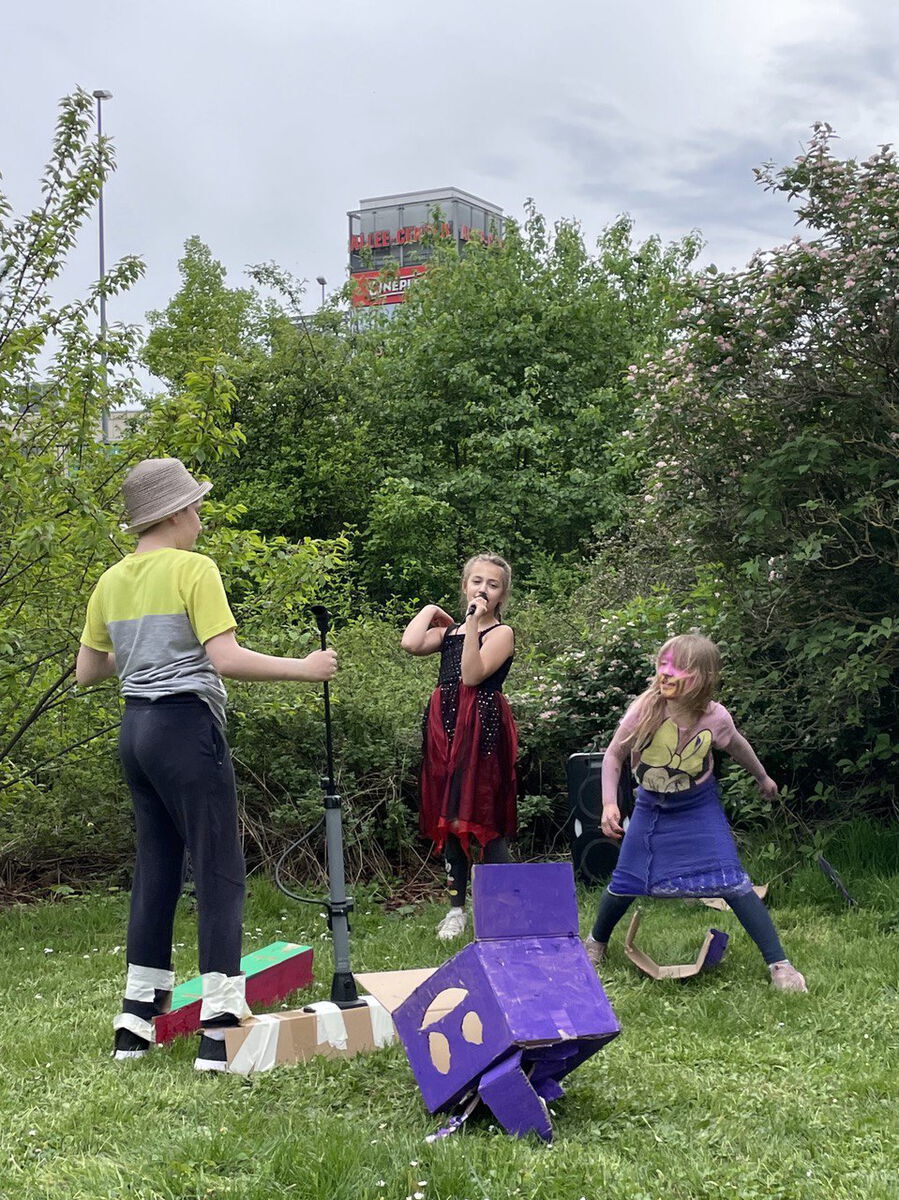 Bereits im Frühjahr begannen die Kids, Wege und Grünflächen vor dem Projektraum in der Alten Salzstraße aktiv zu nutzen: Es wurde getanzt, Theater gespielt, eine Wasser-Bar aufgebaut und eigene Kunstwerke angeboten. Diese Aktionen führten zu vielen kurzen Begegnungen mit Passant:innen und boten einen niederschwelligen Anlass für erste Kontakte und Austausch.