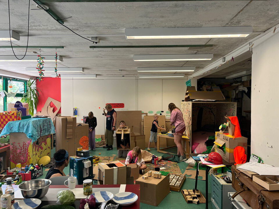 In den Sommerferien luden wir die Kids zu einem künstlerischen Prozess ein, mit dem wir die vielen Einzelaktivitäten im Raum verbinden und Gruppenprozesse fördern wollten. Die Idee dazu entstand aus unseren bisherigen Beobachtungen und dem Umstand, dass zahlreiche neue Kinder den Projektraum für sich entdeckten. Sie probierten viele Materialien aus und bauten mit Begeisterung Buden – vor allem als Büros, die teilweise so klein waren, dass gerade so ein Körper hinein passte. Darin sahen wir vor allem den Wunsch nach einem eigenen Raum , den die Kids nach ihren Vorstellungen gestalten und verwalten können. Hier setzten wir an und entwickelten ein Setting, das eine spielerische Auseinandersetzung mit unserem Jahres-Thema ermöglichte. Damit jedes Kind einen individuellen Büro-Körper oder ein Körper-Büro bauen konnte, wählten wir Pappe als Hauptmaterial – flexibel, leicht umzugestalten und immer wieder neu zusammensetzbar. Es entstanden Papp-Kostüme, Boxen bis hin zu ganzen Häusern. Einige davon bekamen Hausnummern und die Kinder besuchten sich gegenseitig. Andere, wie z.B. ein “Donut Verkaufsstand”, bekamen spezifische Funktionen zugewiesen. So entstanden zahlreiche Raum- und Spielszenarien, an denen weit über die Sommerferien hinaus gearbeitet wurde.