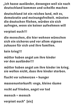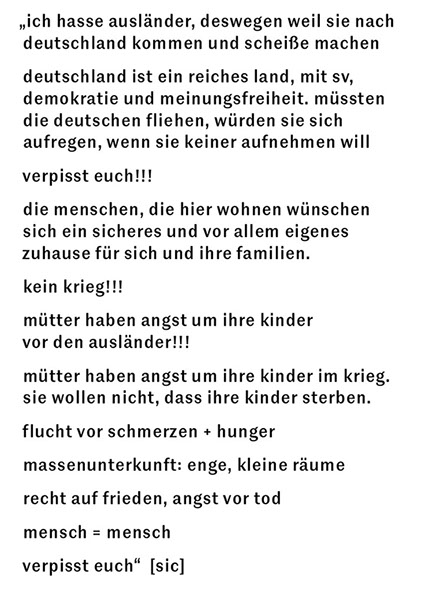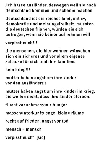ausgehend von unserem titel forschten wir mit den klassen 7 und 9 des förderzentrums für erziehungshilfe grünau zu ausgrenzung, toleranz und rassismus. unsere forschungsmethoden waren dabei künstlerische und in unserem forschungslabor entstand eine raumgreifende installation. hier erforschten wir gleichermaßen uns, die anderen und die welt, sowie die abstände zwischen diesen.